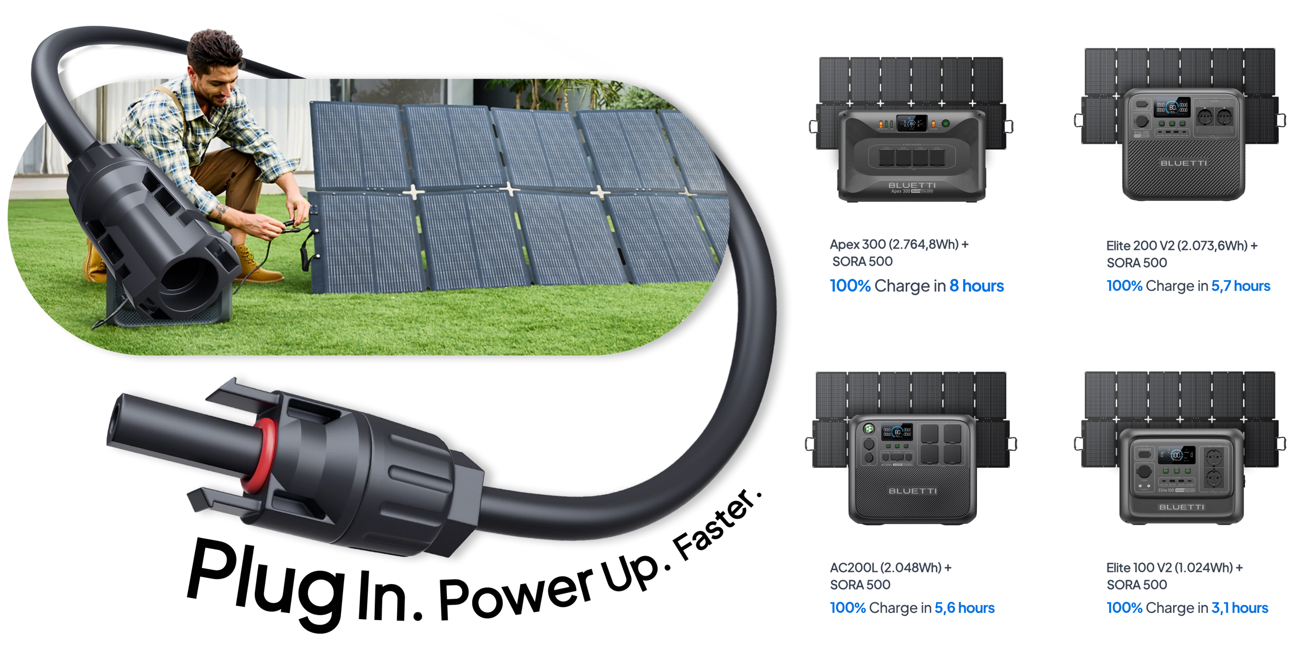 With a universal MC4 connector, SORA 500 works with almost any power station. Charge quickly, get back to adventure, and never wait for power again.