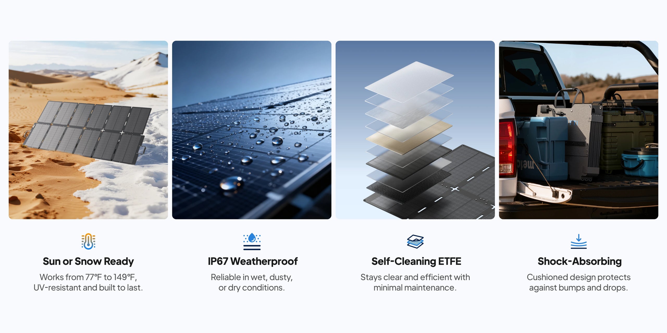 • Go solar anytime: It's IP67 water-resistant and reliable in heat and cold.