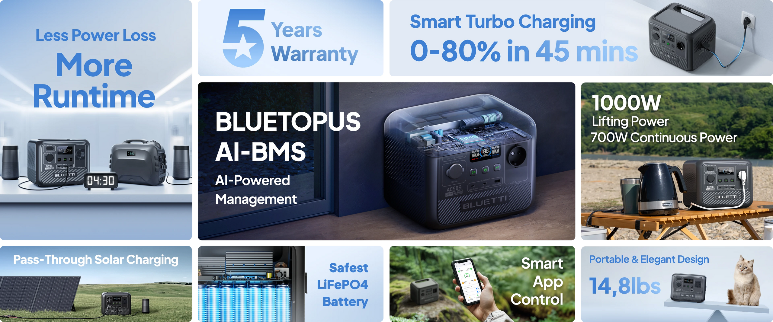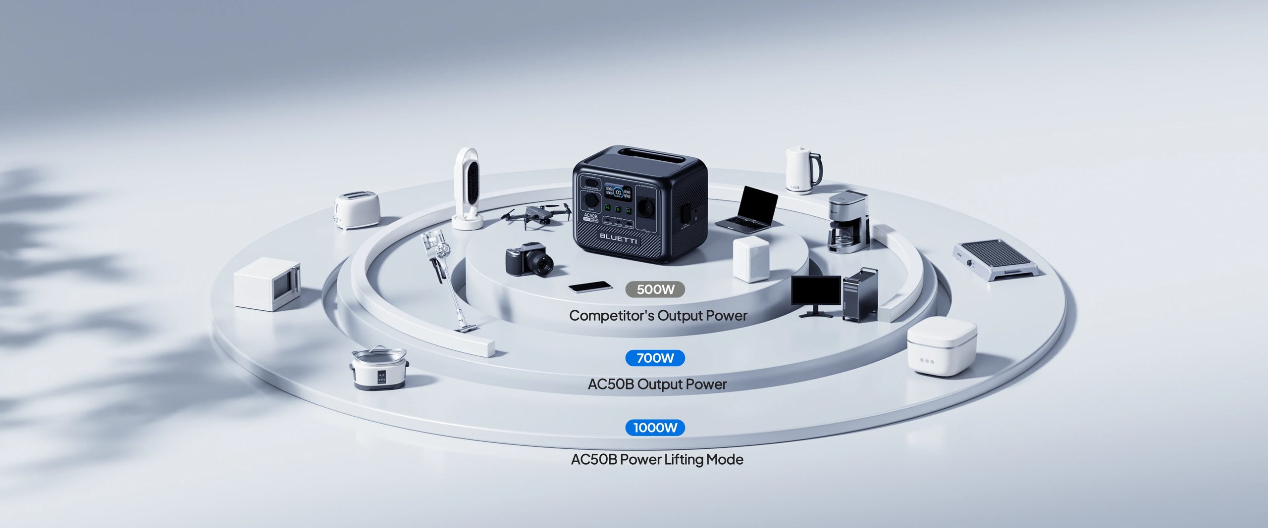 AC50B powers appliances up to 700W. The power lifting mode supports pure resistance devices like kettles and irons under 1.000W load capacity.