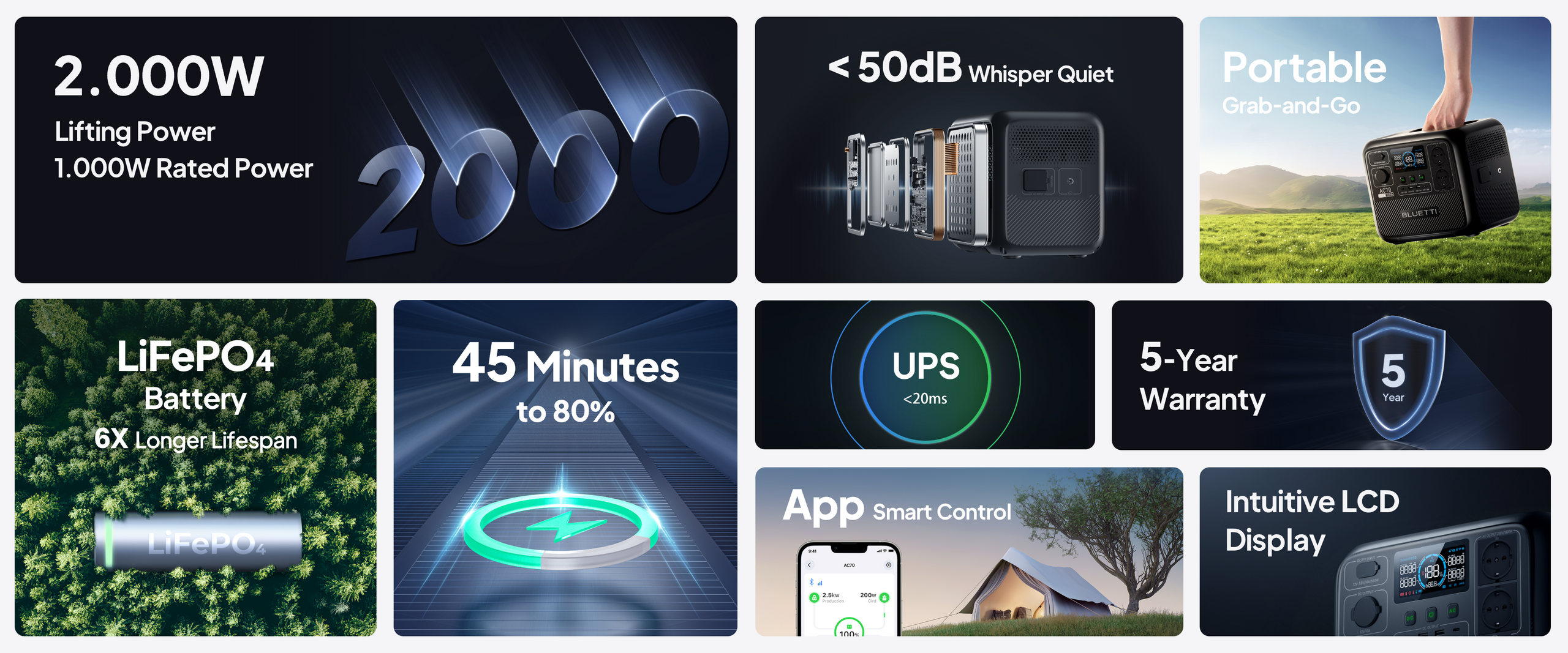 AC70 uses Lithium-ion Phosphate batteries (LiFePO4) for safety and durability, ensuring over 3.000 charge cycles while retaining 80% capacity.