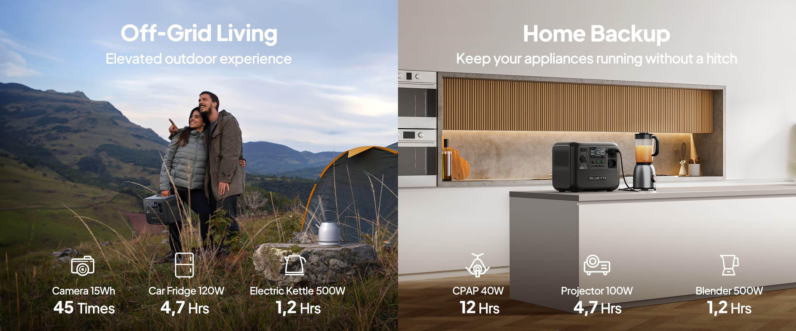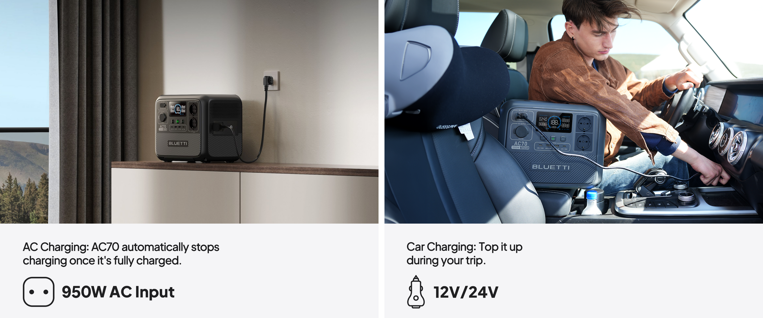 AC70 supports up to 850W AC input. Plug it into a wall outlet and enable the Turbo Charging mode on the BLUETTI App, and you can fill it up in only 1,3-1,6 Hours .