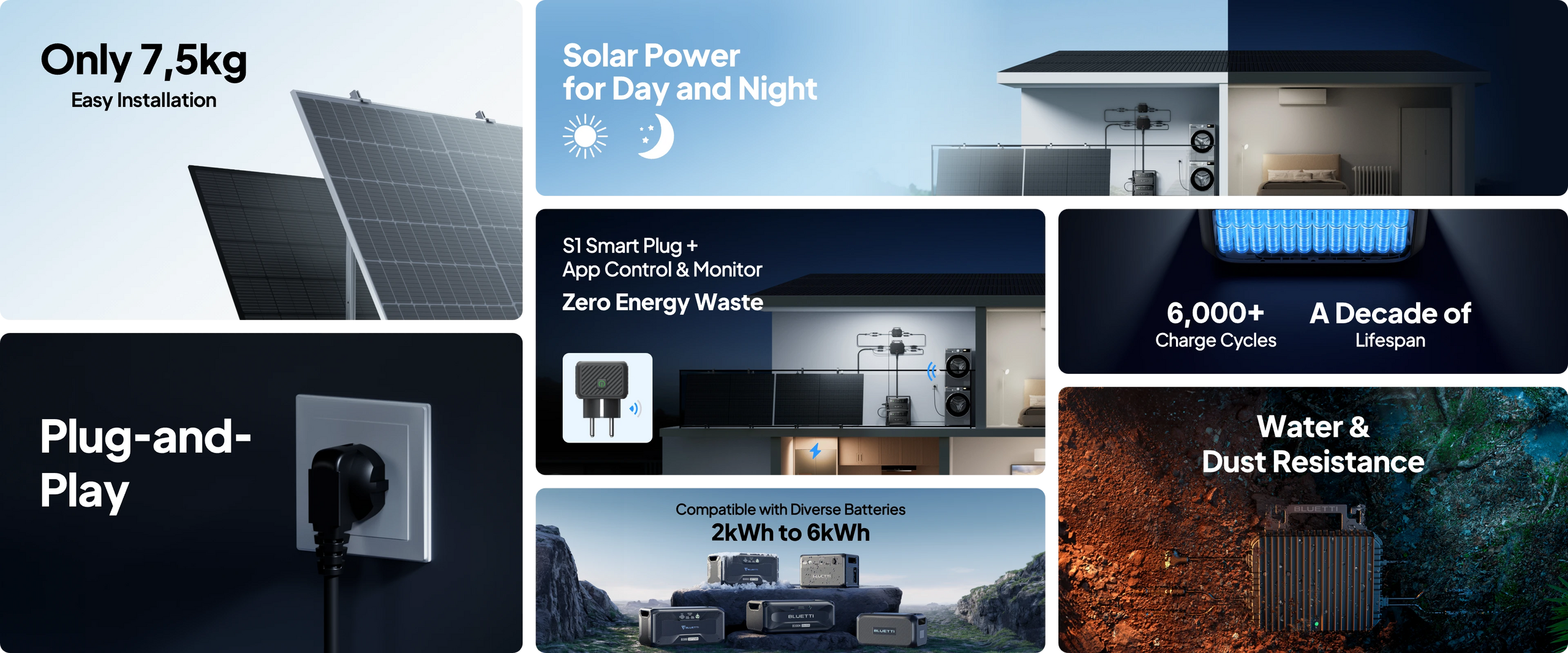 BLUETTI Balcony Solar System is a highly efficient grid-tied energy storage system. It can capture solar energy during the daytime to power your home essentials and store extra energy to power through the night, helping you save on electricity bills.