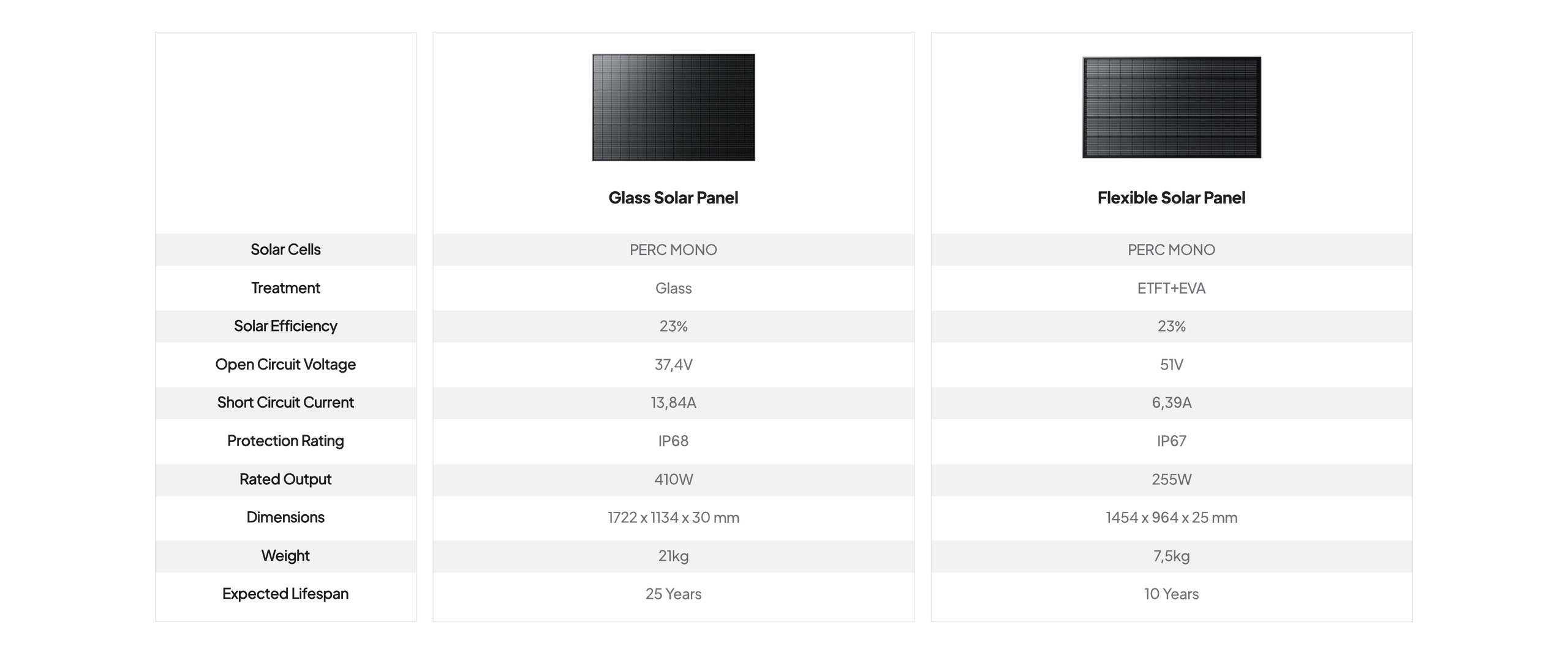 The flexible solar panel is lighter, yet it has lower input power than the glass solar panel. However, flexible solar panel has an IP67 rating, while glass solar panel has an IP68 rating to resist water and dust, and can withstand strong winds. Please refer to the specs to find out the best option that's right for you.