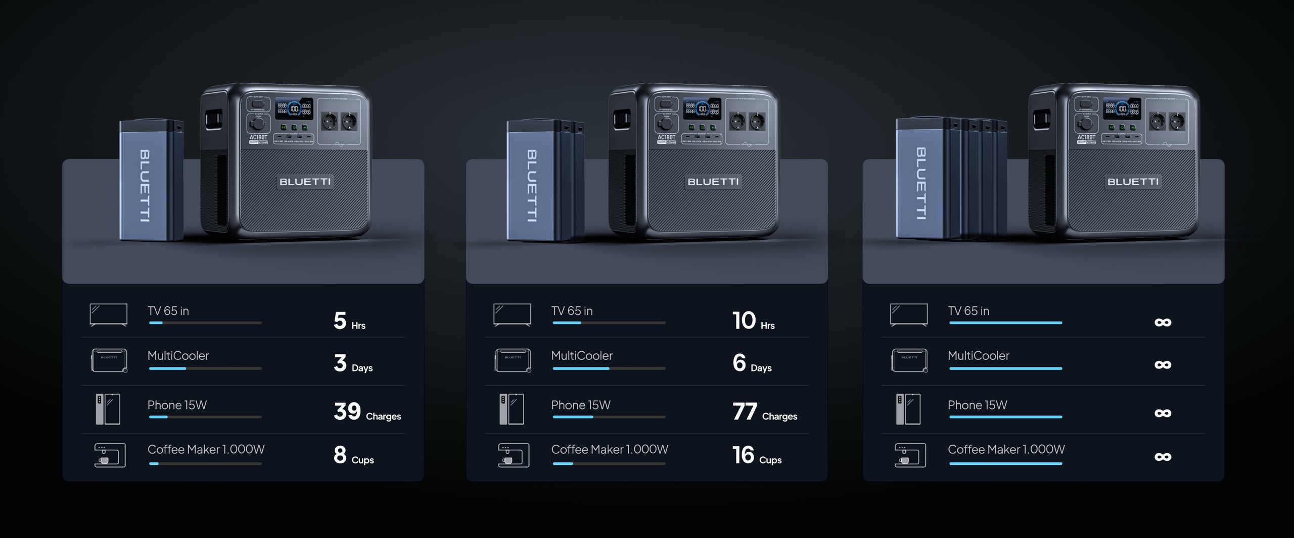 For week-long road trips or an off-grid lifestyle, BLUETTI's first ecosystem keeps your devices powered, food fresh, and drinks ice cold, all in an efficient and sustainable way. The interchangeable B70 battery fits both the AC180T and the Multicooler, offering extreme flexibility and convenience.