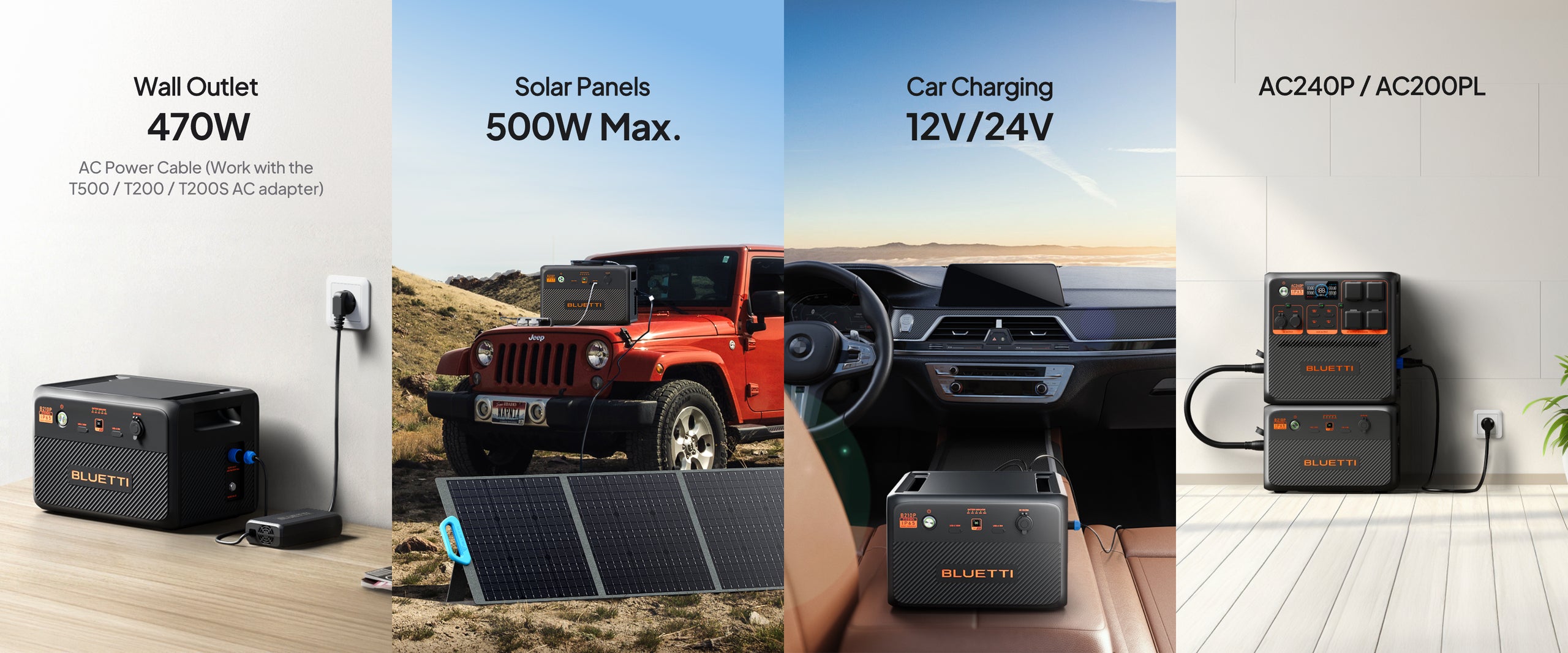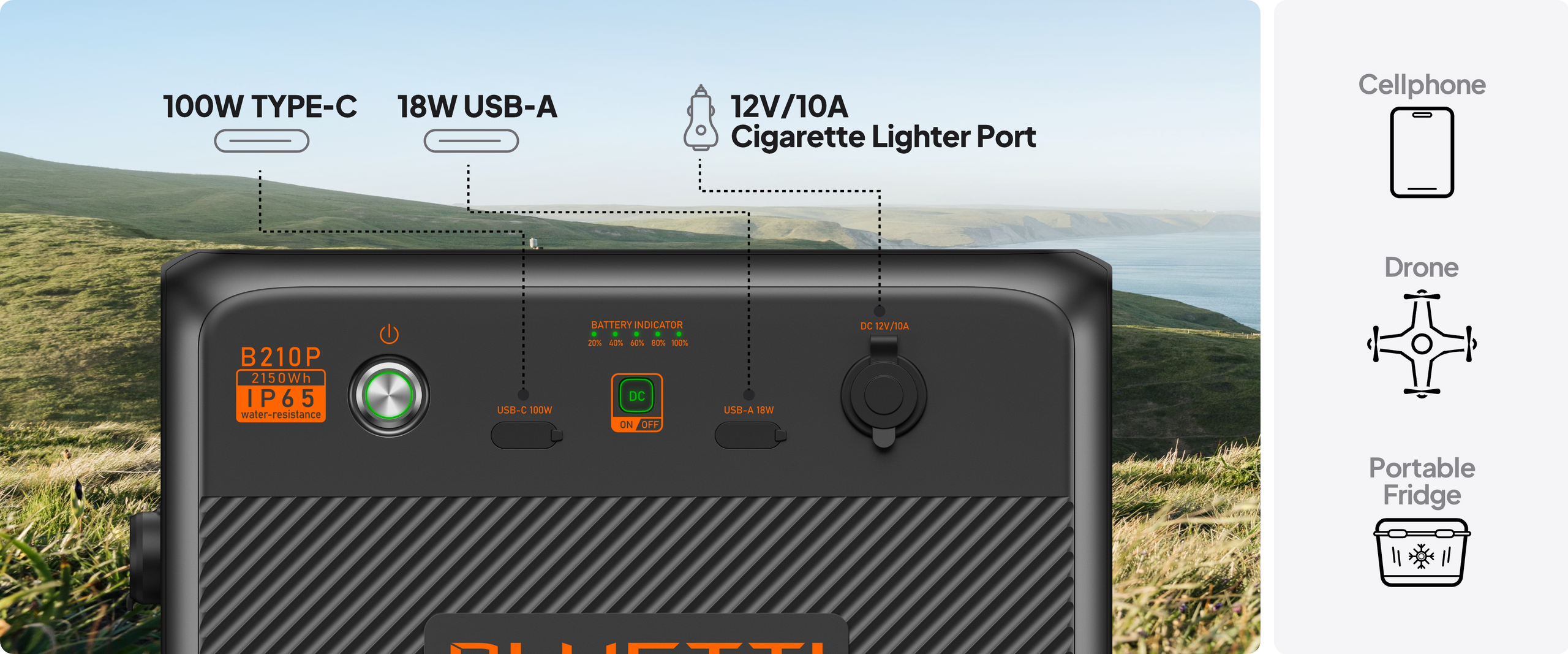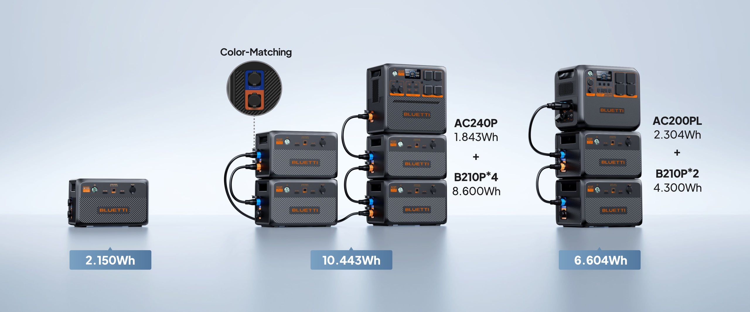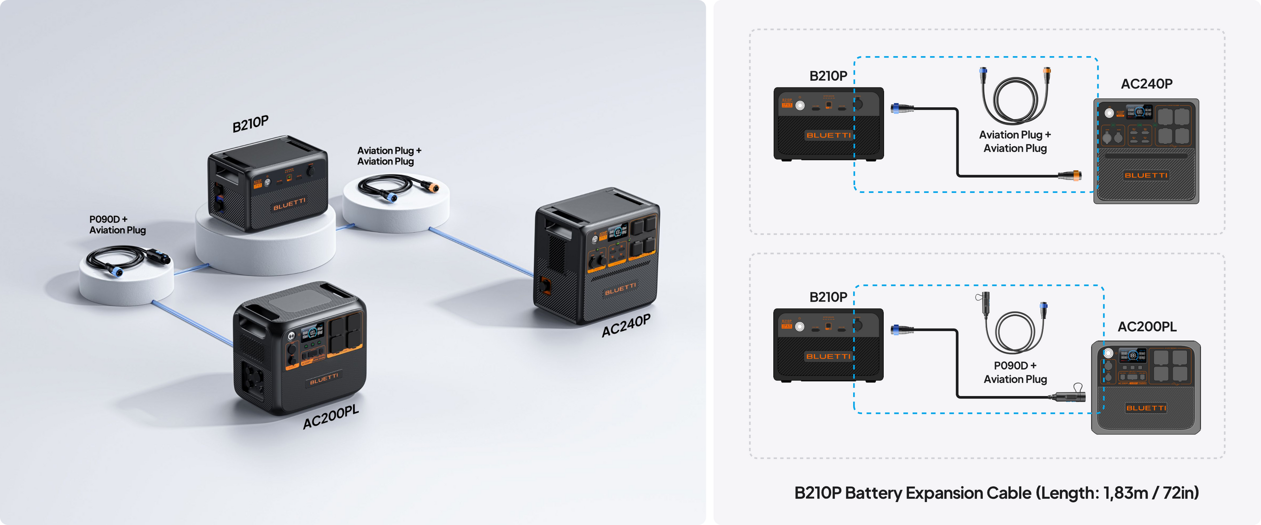 A: As an expansion battery, B210P is compatible with BLUETTI AC240P and AC200PL(extra cable required), with up to 4 and 2 units, respectively.