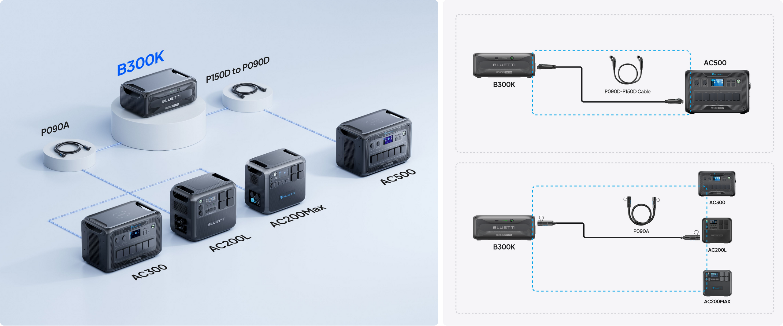 B300K is compatible with AC200L, AC200MAX, AC300, and AC500. The P090D to P150D cable is required for connecting with AC500 and sold separately.