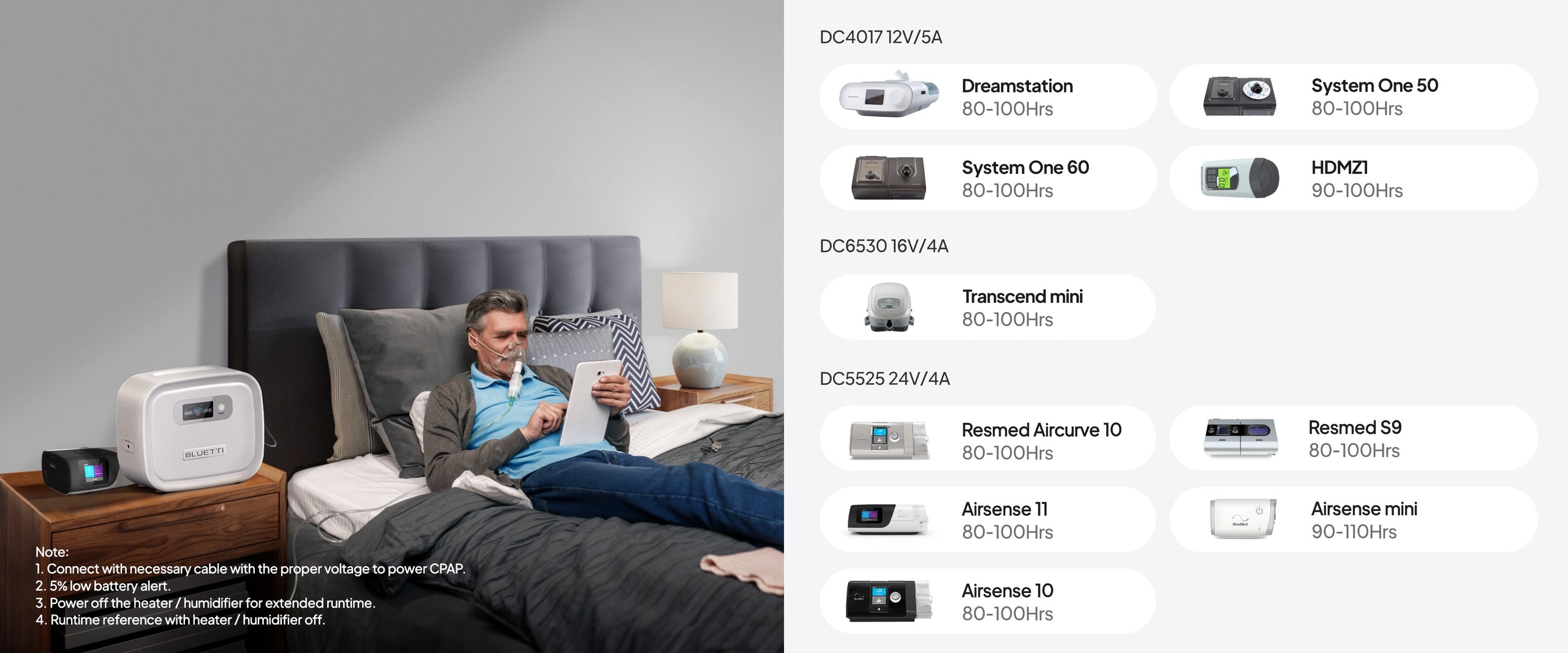 A3.X60 is compatible with over 90% of CPAPs on the market, such as Dreamstation/ SYS ONE 60 / REMstar System One1 50 / HDM Z1 / SYSTEM one 60 / Transcend Mini CPAP/ Rsemed Airsense/ Aircurve / Rsemed S9/ Airsense 11/ Airsense Mini, etc. If you're not sure about the compatibility of your specific CPAP device, please feel free to contact our service team at sale-eu@bluettipower.com