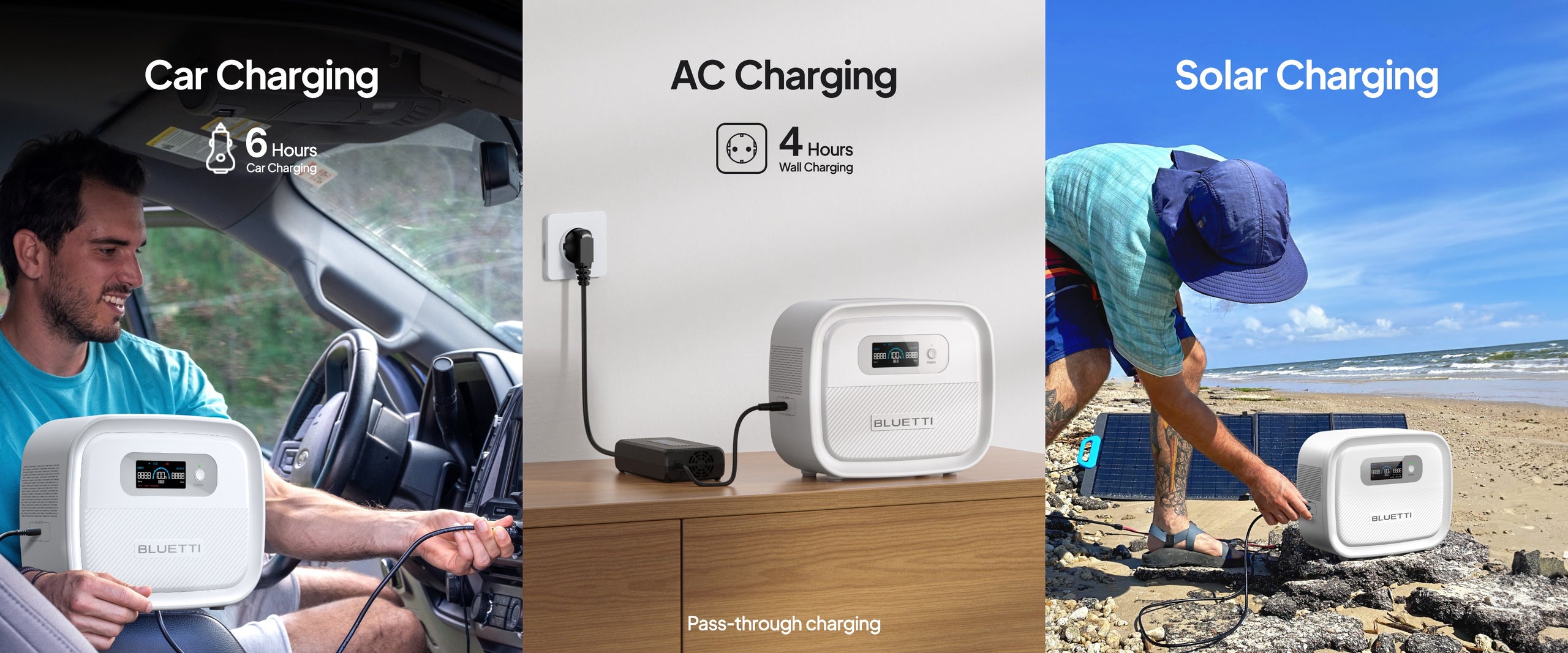 A6. AC charging / Car charging / PV charging. Please note that the AC adapter and DC power cable are included, while the DC 7909 cable for solar charging is sold separately