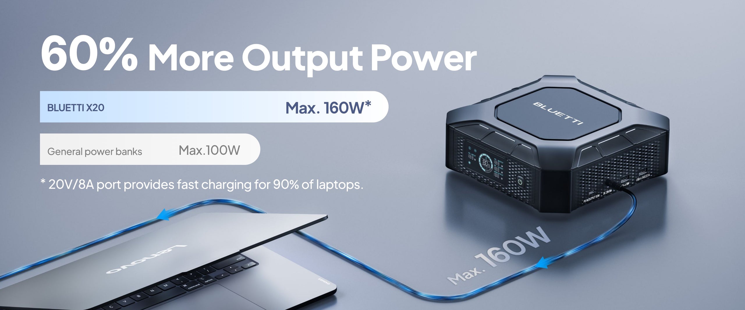 A: The X20 features a USB-C port and a 20V/8A output, making it compatible with over 90% of laptops on the market.