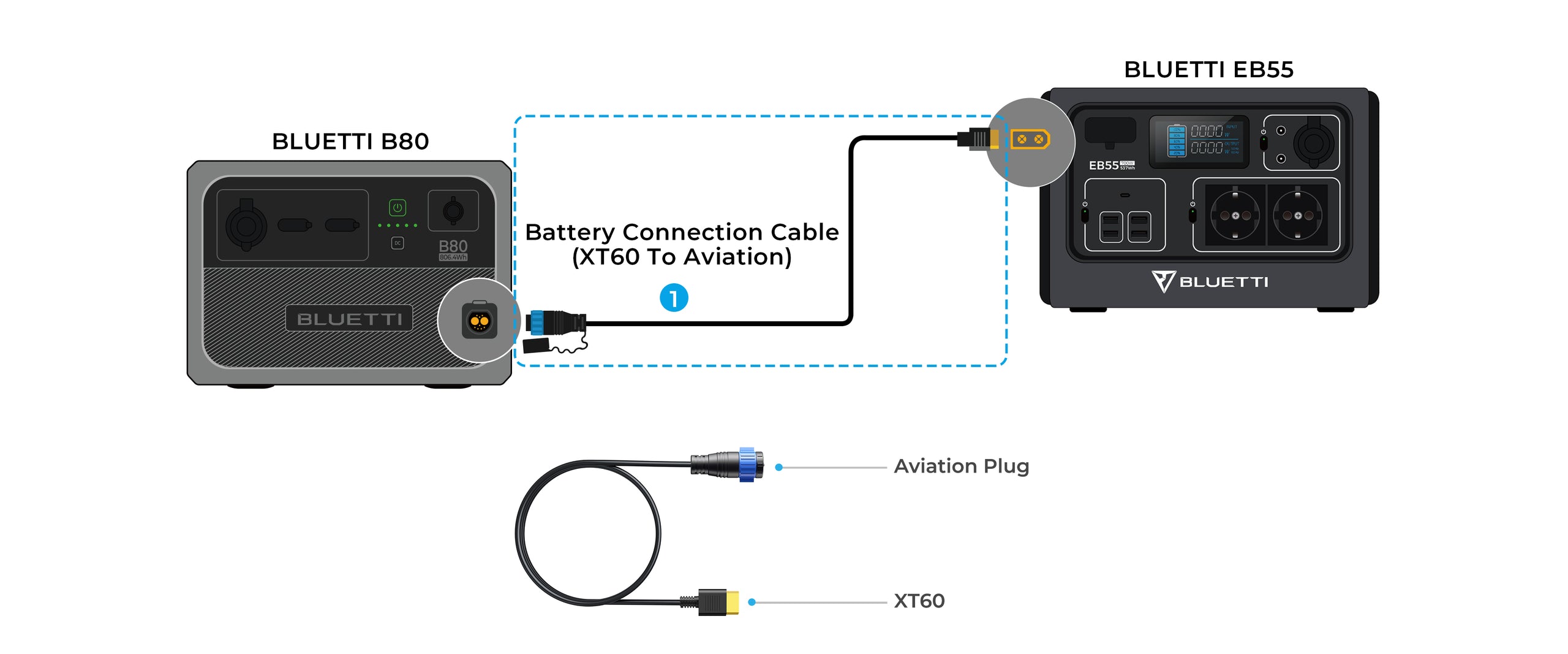 To increase your EB55/AC2A/AC70/AC50B's run time, use this cable to connect it to the B80 expansion battery. It adds an extra 804Wh capacity while the B80 is in Power Bank mode, giving you extended power for your device.
